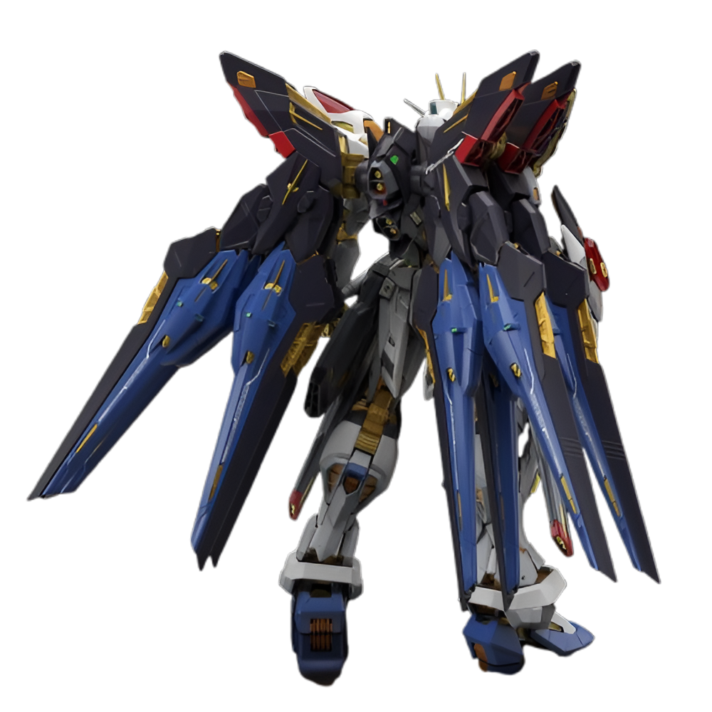 Strike Freedom’s gold inner frame shines straight out of the box thanks to 6 different metallic processes—electro-plating, two metallic injections and etched decals—while full-burst wings, DRAGOON rifles and beam sabers snap on with perfect tolerances.