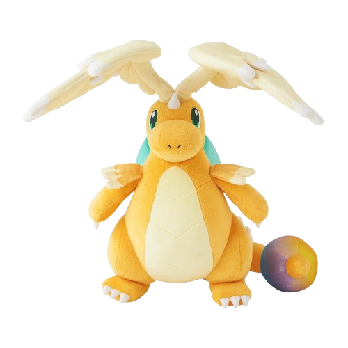 Pelúcia original do Pokémon Center do Mega Dragonite. Grande, macia e perfeita para display, com asas enormes e um visual super carismático, ideal para colecionadores e fãs do Dragonite.